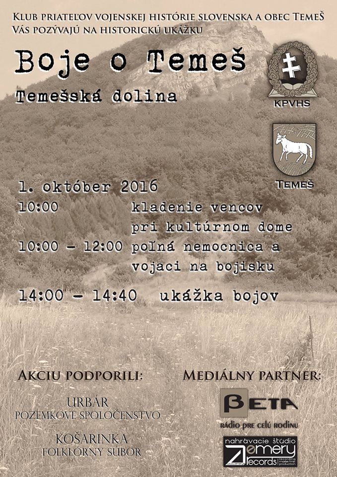 Milí spoluobčania, rodáci, návštevníci, 1.októbra 2016 už po druhýkrát - Samospráva obce Temeš, KPVHS a Urbár, pozemkové spoločenstvo - pripravujú pre Vás tematické podujatie „Boje o Temeš“. Podujatie sa uskutoční na Temešskej doline - oproti rybníkom. Parkovanie, chutný guláš a občerstvenie, je zabezpečené. Príďte stráviť pekný deň, pozrieť si poľnú nemocnicu a ukážku bojov. Sloboda neprišla sama, bolo ju treba vybojovať a tento fakt treba neustále pripomínať našim deťom a vnúčatám. Prejsť na pozvánku ...