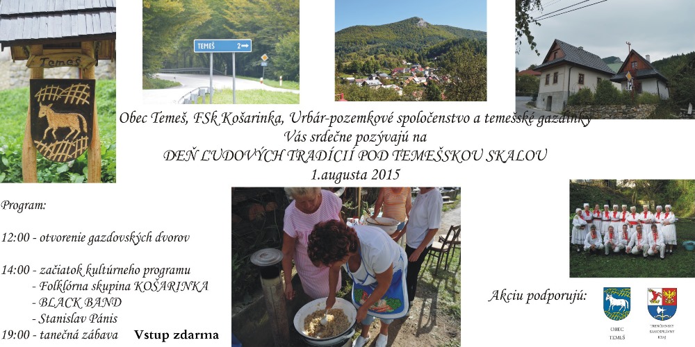 Obec Temeš, FSK Košarinka, Urbár-pozemkové spoločenstvo a temešské gazdinky Vás srdečne poývajú na Deň ľudových tradícií 1.augusta 2015. Vstup samozrejme zdarma. Prejsť na program ...